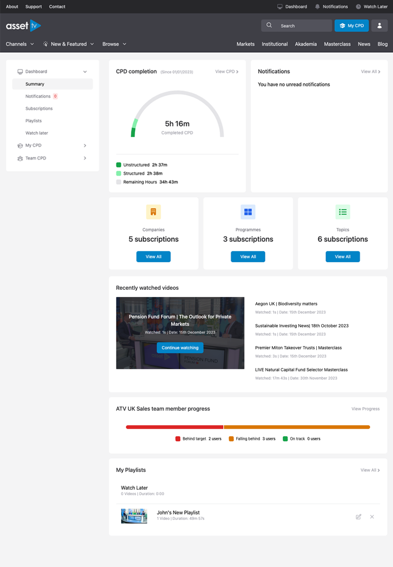 From your Dashboard, you'll get a clear overview of your activity and account on Asset TV. It provides quick links to manage everything, including: