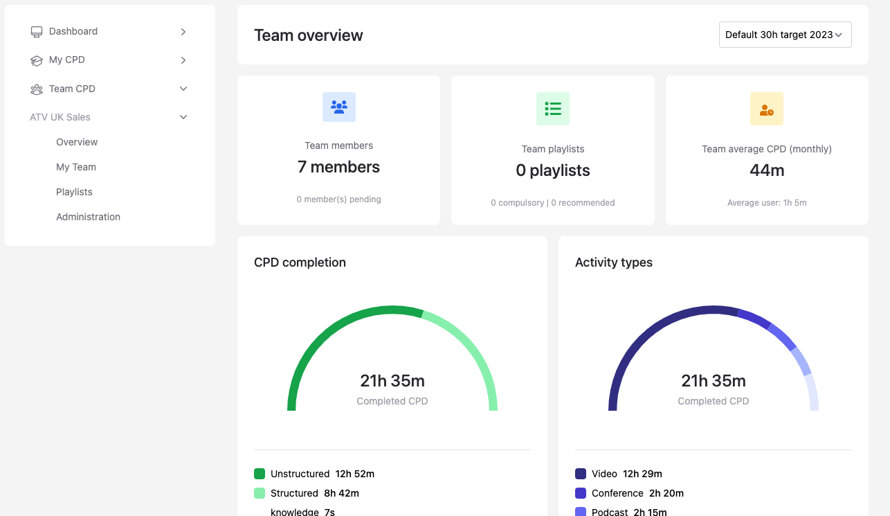 As a manager of a Team CPD account you will have access to a range of specialist tools to help you manage your teams continuing development. You will need to sign in to Asset TV to access Team CPD, once signed in you can access Team CPD via the navigation menu to the left of you dashboard.