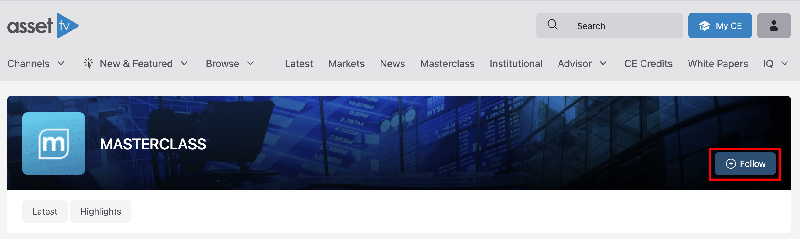 To follow a channel, simply click the "Follow" button located in the header of the page: